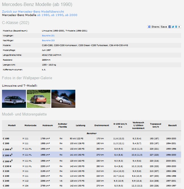 Heute wurde die Modellseite der Baureihe W 463 komplett überarbeitet und mit Inhalten gefüllt. Es werden jetzt (hoffentlich) alle Motorvarianten und Modelle mit den entsprechenden Leistungswerten aufgeführt. Gleichzeitig wurde die Lesbarkeit deutlich verbessert. Hierfür habe ich auf ein sehr gutes Zebra Plugin zurückgegriffen, so dass jetzt einzelne Tabellenzeilen auch farblich hervorgehoben werden. Hier am Beispiel der W202 Modellseiten: