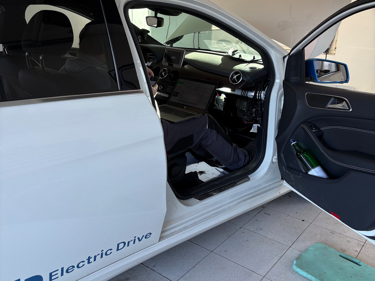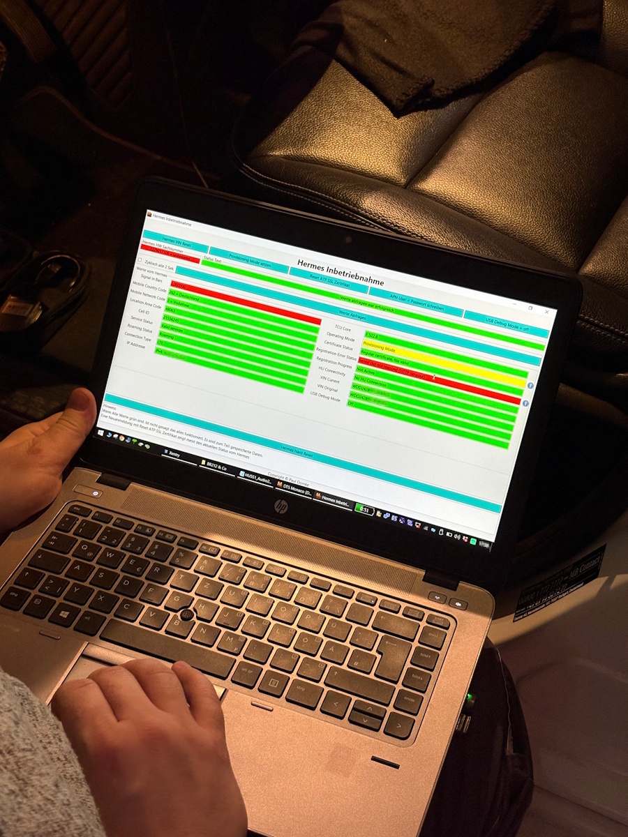 Dafür gibt es im Xentry eine eigene Inbetriebnahme-Routine. Während der Programmierung heißt es Warten und sich von Fehlermeldungen nicht aus der Ruhe bringen lassen. Leider brauchte es nochmal eine kleine Anpassung, das Kombiinstrument meldete mit dem neuen Modul plötzlich, dass SOS ohne Funktion sei - Martin kannte zum Glück den Grund und es musste noch vom Airbag-Modul ein neues Kabel zum HERMES-Modul gezogen werden. Außerdem musste auch die Art der im Fahrzeug verbauten Mobilfunkantenne (0db) dem HERMES-Modul noch einprogrammiert werden. Am Ende dauerte es nach erfolgreichem Codieren nochmals etwa 30 Minuten, bis das HERMES-Modul erfolgreich auf den Mercedes-Servern registriert wurde, Zertifikate ausgetausch wurden und die Mercedes-App meldete: "Digitale Extras wurden aktualisiert" - seit diesem Zeitpunkt kommen jetzt alle Infos live und in Echtzeit in der Mercedes-App an. Und auch die Standheizung reagiert wieder und lässt sich innerhalb von ca. 10 Sekunden per Knopfdruck in der App einschalten oder eine Abfahrtszeit konfigurieren. Das war vorher mit dem alten Kommunikationsmodul gar nicht mehr möglich.
