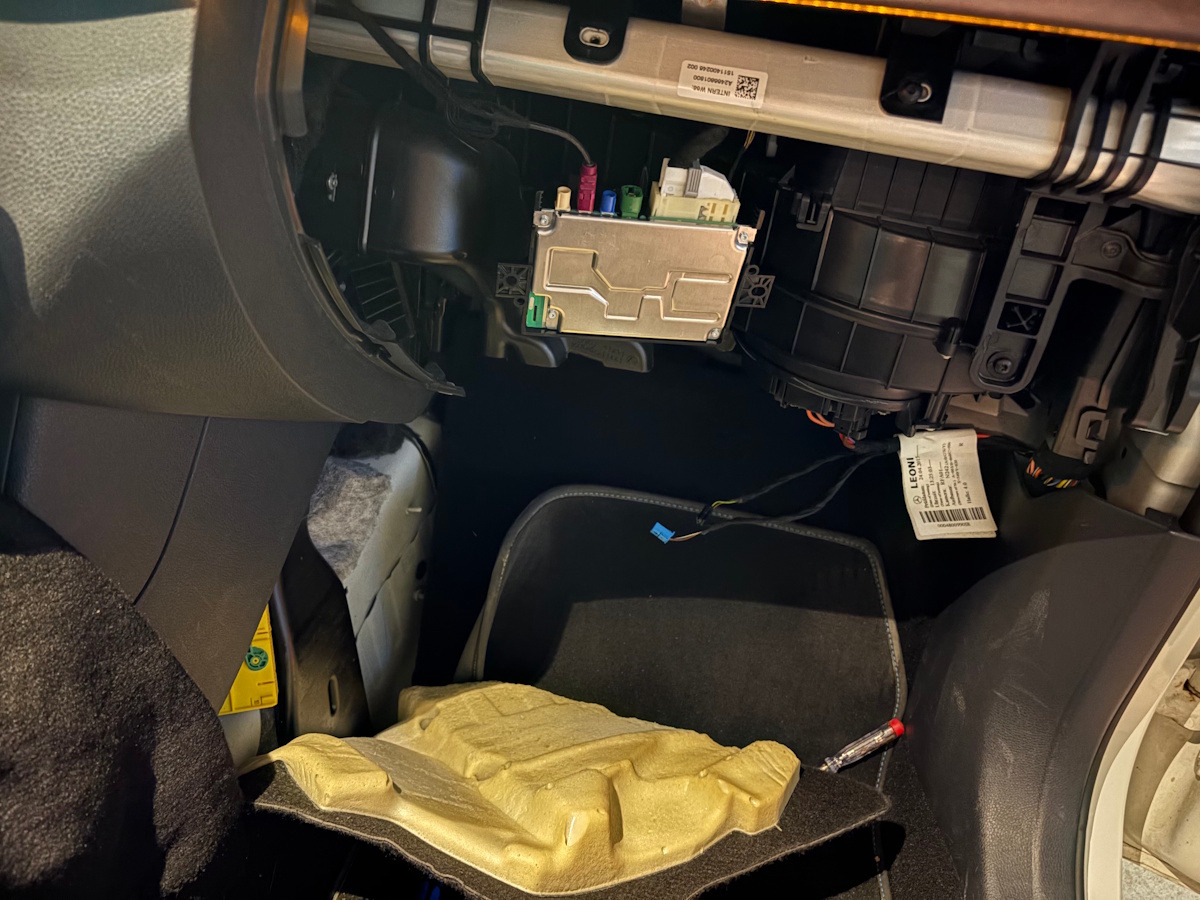 Endlich angekommen ging es auch schon ans Umrüsten. Handschuhfach inkl. Verkleidung raus, mit etwas Fingerspitzengefühl die zwei Schrauben vom PEIKER-Modul entfernt, Kabel abgesteckt und durch ein HERMES-LTE-Modul ersetzt. Der Stecker ist ein anderer, aber die Kabel sind grundsätzlich die Gleichen. Also musste alles vom alten Stecker auf den neuen umgepinnt werden. Danach wurde umcodiert. In der Mercedes-Diagnose-Software Xentry ist unter N112/2 das alte PEIKER-Kommunikationsmodul 'Telematikdienste' (KOMO) aufgeführt, das neue unter N112/9 Steuergerät für Telematikdienste (HERMES).
