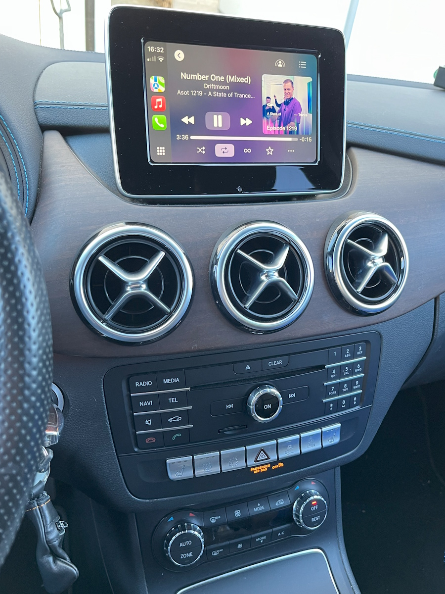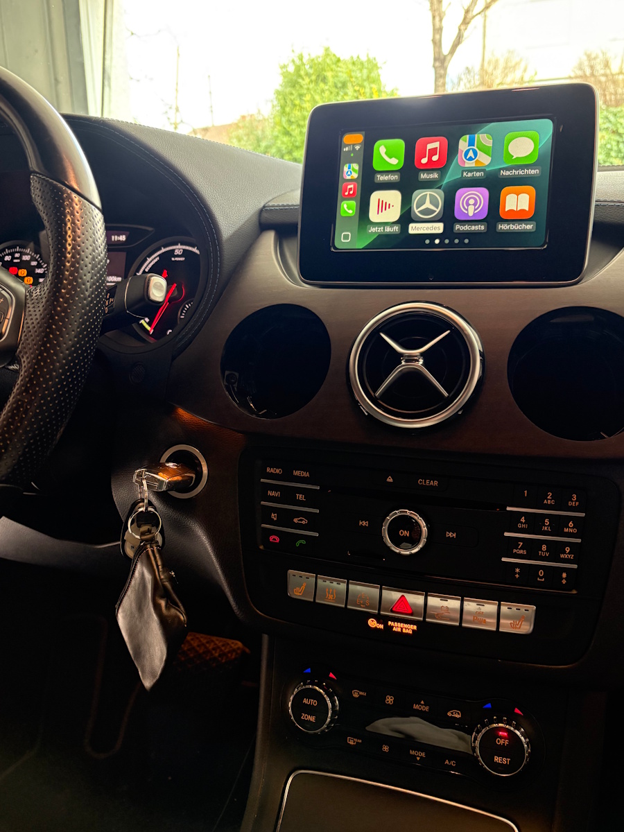 Verbaut ist ein Audio 20 NTG5*1/NTG5S1/NTG5Star1 mit kleinem 7-Zoll-Bildschirm (Auflösung 800x480 Pixel). Eigentlich können die NTG5-Geräte recht einfach für CarPlay aktiviert werden (egal ob Comand oder Audio 20). Dafür gibt es bspw. einfache blaue ODB-II-Dongles aus China, die diese Funktion aktivieren. Wenn denn die Headunit den richtigen Hardware-Stand hätte. Leider ist meine B-Klasse bereits im Frühjahr 2015 gebaut worden und die ersten NTG5*1-Modelle unterstützen Hardware-seitig keine Aktivierung von CarPlay. Mein NTG5*1 wurde von Panasonic im April 2015 hergestellt und hat die HW-Version 14/12 (HW-Partnumber A2469017303 oder andere mit Endnummer 03). Die Freischaltung klappt leider erst ab HW-Version 15/15 (oder HW-Partnumber mit Endnummer 05, 06 oder 07). Das heißt entweder eine Box von einem Dritthersteller kaufen, die dann zwischen Headunit und Bildschirm gesteckt werden muss und den Ton per AUX oder Bluetooth mehr schlecht als recht überträgt, oder eben ein neueres NTG5*1 suchen. Ich hab mich für die zweite Option entschieden, es soll ja alles Original bleiben.